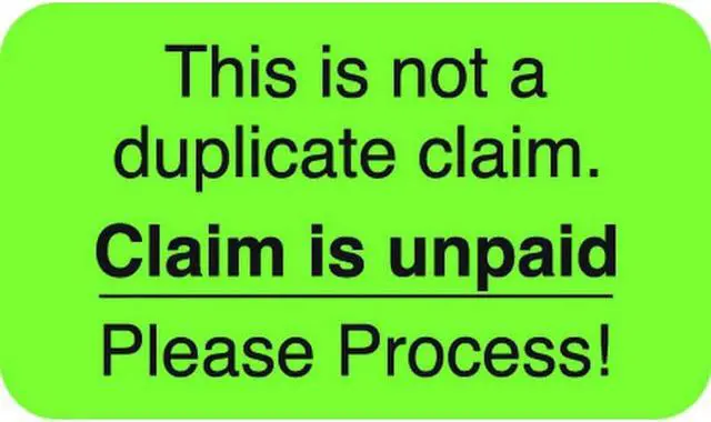 Insurance Labels, Claim is unpaid - Please Process!, Fluorescent Green, 1-1/2" W x 7/8" H (Roll of 250)