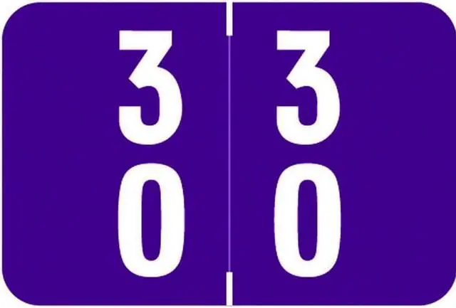 These Smead DDS Double Digit Compatible "30" Numeric Labels are Purple labels with a White "30". Each roll contains 50 of each of the 10, 2-digit combinations: 30, 31, 32, 33, 34, 35, 36, 37, 38, & 39. Label Size: 1-1/2" W x 1" H, Before Folding.