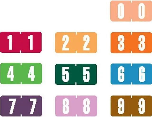 Tab Compatible Mini Numeric Labels, Vinyl Kimdura Stock, 1/2" X 1", Starter Set - 10 Rolls of 500 Vinyl Kimdura 10 distinct colors 500 per roll 10 Rolls of 500 Compatible with Tab Products 1277 LABEL SIZE: 1" W x 1/2" H, Before Folding 6
