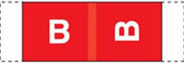 These Col R Tab 11950 Series Compatible "B" Polylaminated Labels with a White "B" printed on a Red background. Label Size: 1-1/2" W x 1/2" H, Before Folding.