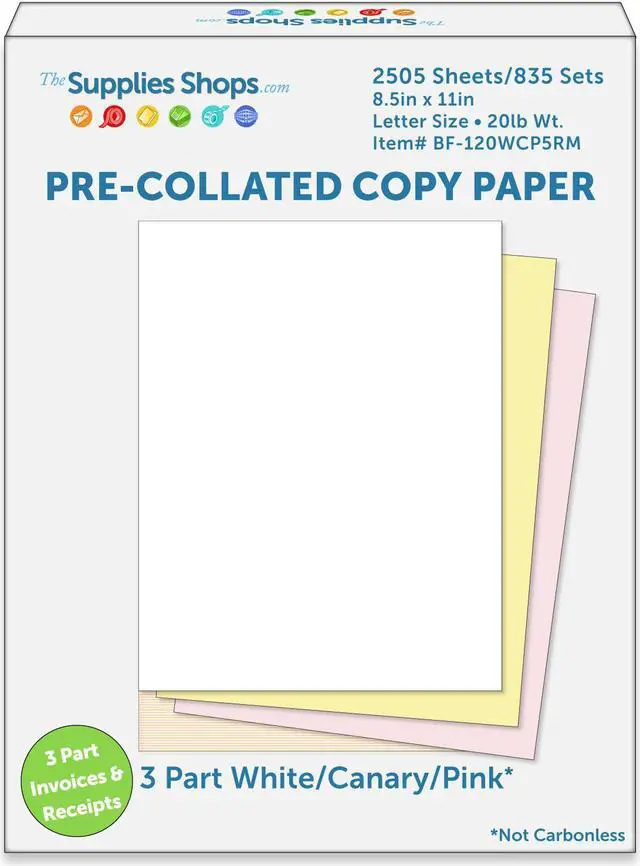 The 20# pre-collated bond colored copy paper is ideal for use in laser, inkjet and digital printers and copiers. Often used by hospitals, data processing centers, insurance companies, schools, and any other business where applications and processes may use regular white copy paper, these pre-collated sets of copy paper can be used for multi-part invoices, delivery receipts, statements, and packing lists among other things. You can convert any standard copier or printer into an efficient business machine where color coded work orders or invoices for the customer and company can be created in one fell swoop.