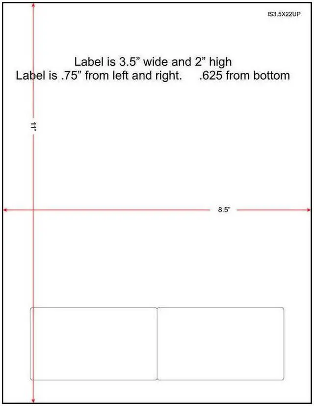 3-1/2" x 2" ( 3.5" x 2"), 24 lbs., 24# Stock, 8.5" x 11" Laser Cutsheet, 2 Labels / Sheet, 1, 500 Sheets / Carton composed of 6 packs of 250 shrink wrapped sheets. Labels are 3.5" wide by 2" high, and are located 0.75" from the left and 0.625" from the bottom.