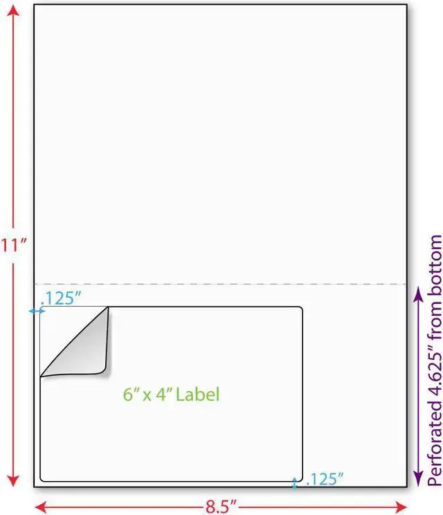 6" x 4", 24 lbs., 24# Stock, 8.5" x 11" Laser Cutsheet, 1 Label / Sheet, 1, 500 Sheets / Carton composed of 6 packs of 250 shrink wrapped sheets. Labels are 6" wide by 4" high, and are located 0.125" from the Left, and 0.125" from the bottom. There is a horizontal perforation 4.625" from the bottom.
