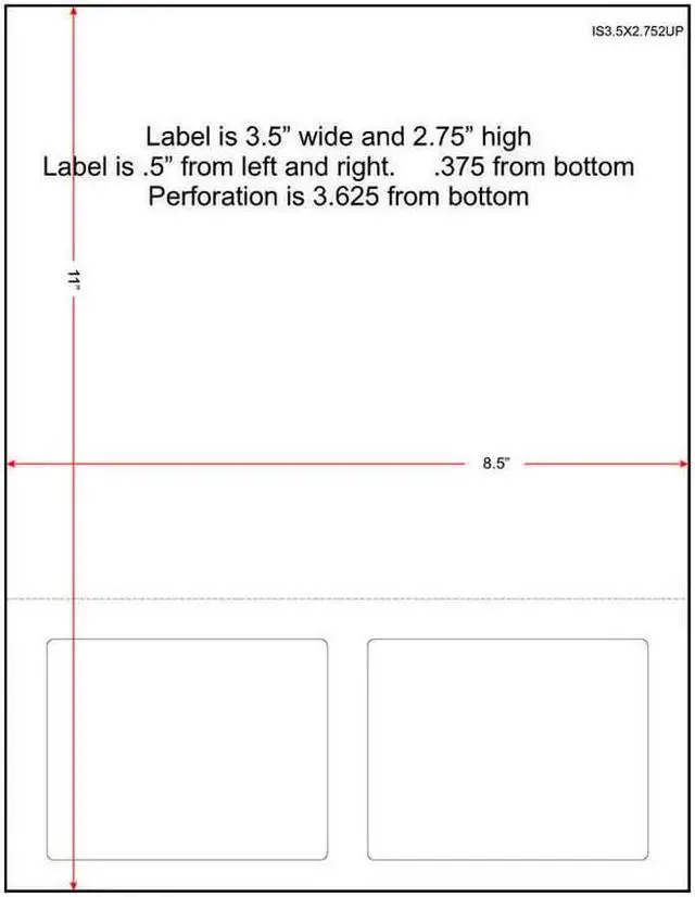 3-1/2" x 2-3/4" ( 3.5" x 2.75" ), 24 lbs., 24# Stock, 8.5" x 11" Laser Cutsheet, 2 Labels / Sheet, 1, 500 Sheets / Carton composed of 6 packs of 250 shrink wrapped sheets. Labels are 3.5" wide by 2.75" high, and are located 0.5" from the left and right, and 0.375" from the bottom. There is a horizontal perforation 3.625" from the bottom.