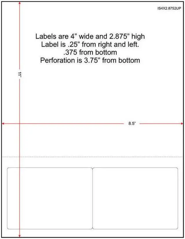 4" x 2-7/8" (4" x 2.875" ), 24 lbs., 24# Stock, 8.5" x 11" Laser Cutsheet, 2 Labels / Sheet, 1, 500 Sheets / Carton composed of 6 packs of 250 shrink wrapped sheets. Labels are 4" wide by 2.875" high, and are located 0.25" from the left and right, and 0.375" from the bottom. There is a horizontal perforation 3.75" from the bottom.