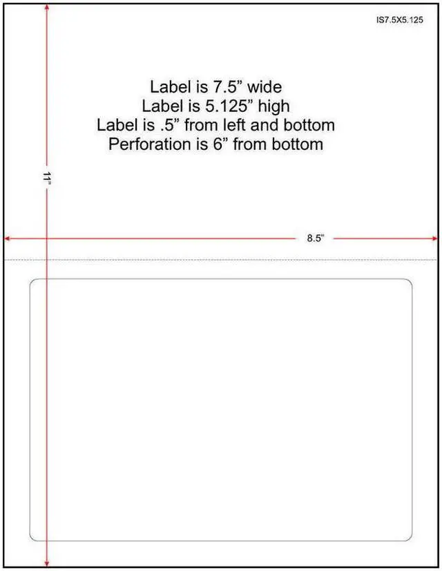 7-1/2" x 5-1/8" ( 7.5" x 5.125" ), 24 lbs., 24# Stock, 8.5" x 11" Laser Cutsheet, 1 Label / Sheet, 1, 500 Sheets / Carton composed of 6 packs of 250 shrink wrapped sheets. Labels are 7.5" wide by 5.125" high, and are located 0.5" from the left and right, and 0.5" from the bottom. There is a horizontal perforation 6" from the bottom.