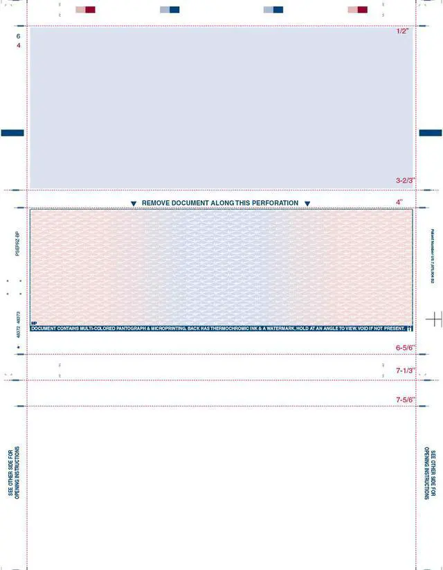 Simply laser print your single sheet of paper, run through the pressure seal equipment to fold, and pressure seal into a mailing piece. Face printing includes a hidden? void? pantograph in the center panel. This style has back printing featuring artificial watermark and thermochromic ink. Your 8-1/2" x 11" form meets postal regulations and is ready to be mailed. This style check has a Z fold with blue and red prismatic pantograph. Sold in boxes of 2000.