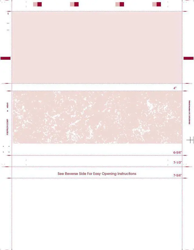 The pressure seal system utilizes a pressure-activated adhesive on a single sheet of paper to create a mailer. There is no need for envelopes! Pressure seal checks elimate the costly steps of manual folding, stuffing, and sealing. Face printing includes a hidden? void? pantograph in the center panel. This 8-1/2" x 11" form has a Z fold with red marble, microprinting, and blue stub. The back has thermochromic ink and a watermark. Sold in boxes of 2000.