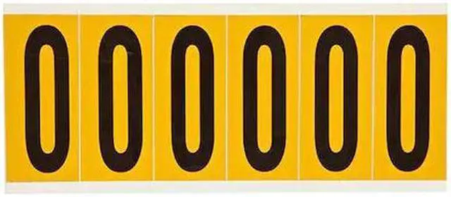Number Label, Adhesive Type Permanent Adhesive, Application General Identification, Pipe and Valve Marking, APWA Compliant Color No, Background Color Yellow, Character Color Black, Character Color Gradient Solid Color, Character Height 3 in, Character Outline Color Not Applicable, Character Type Numbers, Characters Included 0, Die Cut Yes, Embossed No, Font Gothic, Includes (6) Labels, Indoor/Outdoor Usage Indoor/Outdoor, Letter Casing Uppercase, Material Vinyl