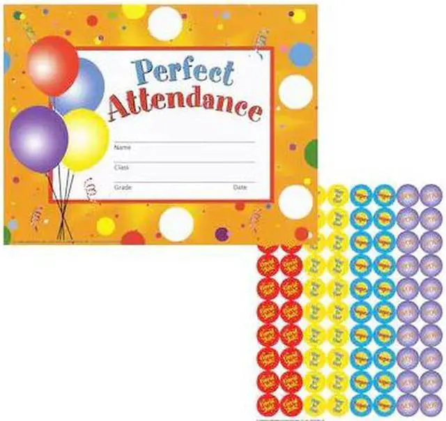 Perfect Attendance Certificates and Reward Seals are great way to reward students for not missing a day of school. Great for teachers to use as classroom incentives. These beautifully designed Hayes certificates are printed in full color on high quality matte paper. This certificate set includes 30 8.5" x 11" reward certificates, 160 reward seals, and an instructor's guide per bundle. There are 5 bundles included in this five pack for 150 certificates and 800 reward seals. Students will take pride in their achievements as they work to earn more reward seals for their certificates.
