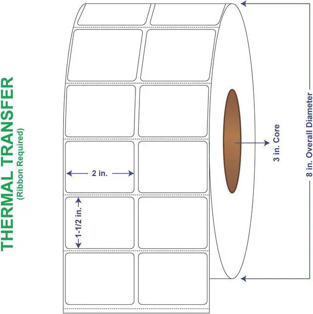 General Use Label w/ Perf Thermal Transfer Labels come 7000 labels per roll and 4 rolls per carton for a total of 28000 labels per box. These thermal transfer label rolls have an 8" outer diameter and 3" core. Perforated thermal transfer labels have a horizontal perf every 1-5/8". A versatile general purpose permanent emulsion acrylic adhesive offers excellent initial tack and ultimate adhesion, especially at lower temperatures, without sacrificing high-speed converting. This adhesive meets the requirements of FDA CFR 175.105 for indirect food contact. The minimum application temperature for this adhesive is 30degF and the recommended service temperature range is -65degF to 200degF (-54degC to 93degC).