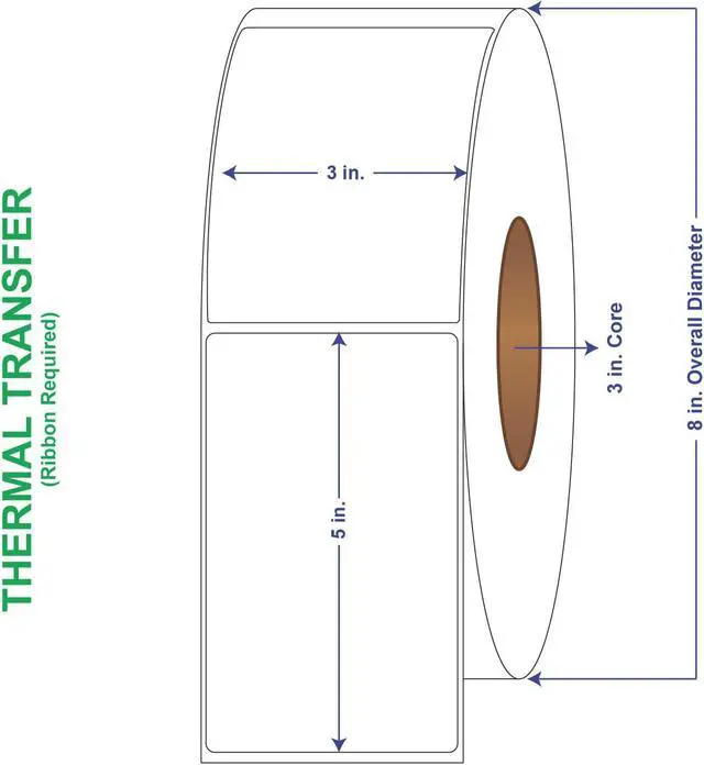 General Use Label Non-Perf Thermal Transfer Labels come 1250 labels per roll and 6 rolls per carton for a total of 7500 labels per box. These thermal transfer label rolls have an 8" outer diameter and 3" core. A versatile general purpose permanent emulsion acrylic adhesive offers excellent initial tack and ultimate adhesion, especially at lower temperatures, without sacrificing high-speed converting. This adhesive meets the requirements of FDA CFR 175.105 for indirect food contact. The minimum application temperature for this adhesive is 30degF and the recommended service temperature range is -65degF to 200degF (-54degC to 93degC).