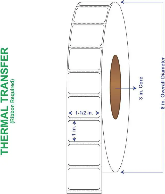 General Use Label w/ Perf Thermal Transfer Labels come 5500 labels per roll and 8 rolls per carton for a total of 44000 labels per box. These thermal transfer label rolls have an 8" outer diameter and 3" core. Perforated thermal transfer labels have a horizontal perf every 1-1/8". A versatile general purpose permanent emulsion acrylic adhesive offers excellent initial tack and ultimate adhesion, especially at lower temperatures, without sacrificing high-speed converting. This adhesive meets the requirements of FDA CFR 175.105 for indirect food contact. The minimum application temperature for this adhesive is 30°F and the recommended service temperature range is -65°F to 200°F (-54°C to 93°C).