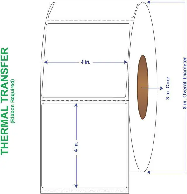 General Use Label w/ Perf Thermal Transfer Labels come 1500 labels per roll and 4 rolls per carton for a total of 6000 labels per box. These thermal transfer label rolls have an 8" outer diameter and 3" core. Perforated thermal transfer labels have a horizontal perf every 4-1/8". A versatile general purpose permanent emulsion acrylic adhesive offers excellent initial tack and ultimate adhesion, especially at lower temperatures, without sacrificing high-speed converting. This adhesive meets the requirements of FDA CFR 175.105 for indirect food contact. The minimum application temperature for this adhesive is 30degF and the recommended service temperature range is -65degF to 200degF (-54degC to 93degC).