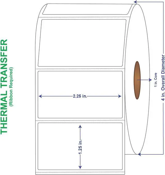 General Use Label w/ Perf Thermal Transfer Labels come 1135 labels per roll and 4 rolls per carton for a total of 4540 labels per box. These thermal transfer label rolls have an 4" outer diameter and 1" core. Perforated thermal transfer labels have a horizontal perf every 1-3/8". A versatile general purpose permanent emulsion acrylic adhesive offers excellent initial tack and ultimate adhesion, especially at lower temperatures, without sacrificing high-speed converting. This adhesive meets the requirements of FDA CFR 175.105 for indirect food contact. The minimum application temperature for this adhesive is 30degF and the recommended service temperature range is -65degF to 200degF (-54degC to 93degC).