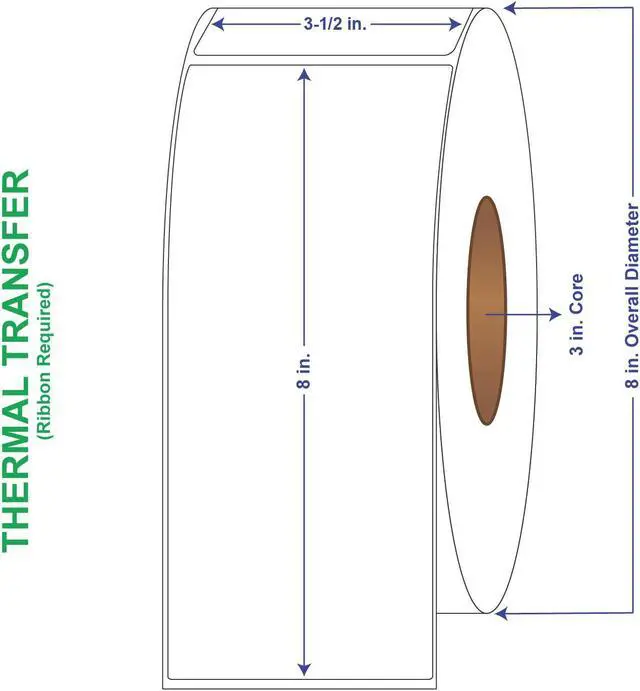 General Use Label Non-Perf Thermal Transfer Labels come 750 labels per roll and 6 rolls per carton for a total of 4500 labels per box. These thermal transfer label rolls have an 8" outer diameter and 3" core. A versatile general purpose permanent emulsion acrylic adhesive offers excellent initial tack and ultimate adhesion, especially at lower temperatures, without sacrificing high-speed converting. This adhesive meets the requirements of FDA CFR 175.105 for indirect food contact. The minimum application temperature for this adhesive is 30degF and the recommended service temperature range is -65degF to 200degF (-54degC to 93degC).