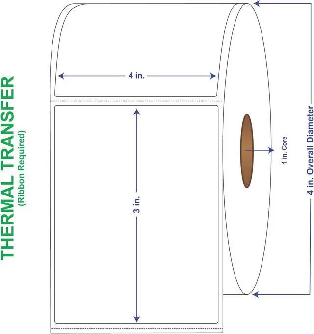 General Use Label w/ Perf Thermal Transfer Labels come 1000 labels per roll and 4 rolls per carton for a total of 4000 labels per box. These thermal transfer label rolls have an 8" outer diameter and 3" core. Perforated thermal transfer labels have a horizontal perf every 6-1/8". General Use Label has Removable Adhesive. The minimum application temperature for this adhesive is 30degF and the recommended service temperature range is -65degF to 200degF (-54degC to 93degC). These labels use a 40# basis weight.