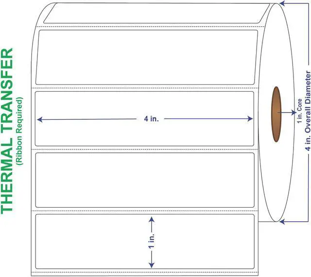 General Use Label w/ Perf Thermal Transfer Labels come 1310 labels per roll and 4 rolls per carton for a total of 5240 labels per box. These thermal transfer label rolls have an 4" outer diameter and 1" core. Perforated thermal transfer labels have a horizontal perf every 1-1/8". A versatile general purpose permanent emulsion acrylic adhesive offers excellent initial tack and ultimate adhesion, especially at lower temperatures, without sacrificing high-speed converting. This adhesive meets the requirements of FDA CFR 175.105 for indirect food contact. The minimum application temperature for this adhesive is 30degF and the recommended service temperature range is -65degF to 200degF (-54degC to 93degC).