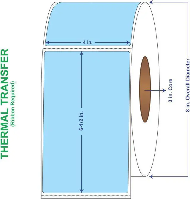General Use Label w/ Perf Tinted Thermal Transfer Labels come 900 labels per roll and 4 rolls per carton for a total of 3600 labels per box. These thermal transfer label rolls have an 8" outer diameter and 3" core. Perforated thermal transfer labels have a horizontal perf every 6-5/8". A versatile general purpose permanent emulsion acrylic adhesive offers excellent initial tack and ultimate adhesion, especially at lower temperatures, without sacrificing high-speed converting. This adhesive meets the requirements of FDA CFR 175.105 for indirect food contact. The minimum application temperature for this adhesive is 30°F and the recommended service temperature range is -65°F to 200°F (-54°C to 93°C).