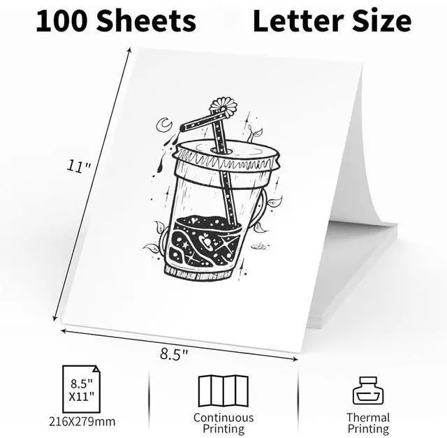 100 brand new thermal printer paper in standard US Letter size 8.5 x 11 inches. No ink or toner required — images appear when heated by compatible thermal printers or fax machines.