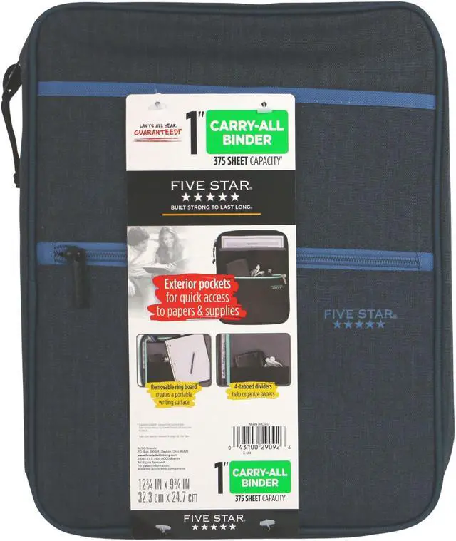 Carry it all in one convenient, zippable spot! The Five Star Carry-All Zipper Binder is ideal for busy days, with plenty of pockets and removable ring board that creates a portable writing surface. You can count on a Five Star Binder throughout the school year. Our sturdy binder is made with durable material that keeps your work secure and protected throughout your busy school day.