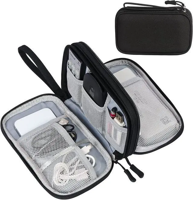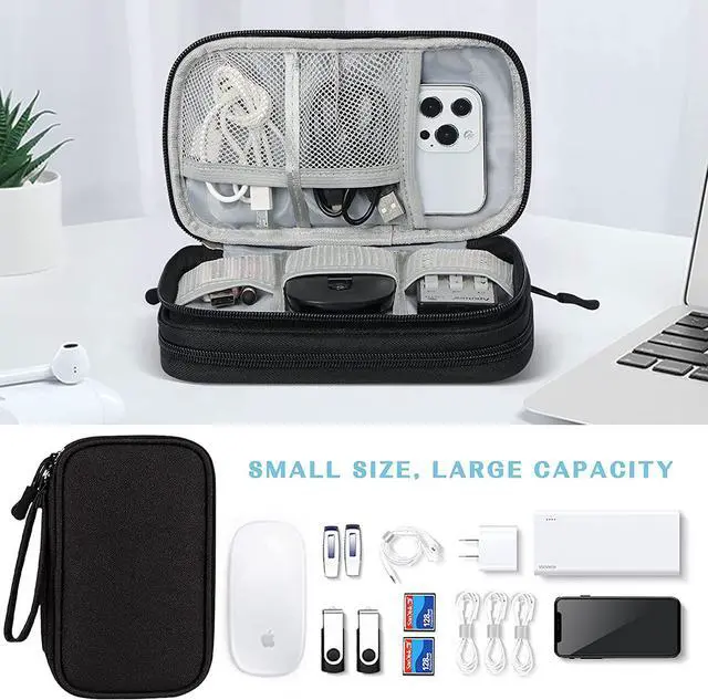 Double Layers Design: The electronics storage bag has 2 layers interior compartment with enough space to take in your cords, cables, USB drive, cellphone, charger, mouse, flash drive, and other accessories.