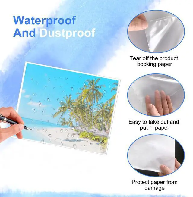 Clear Paper Sleeves ProtectorThe package includes 100 pieces of clear adhesive display protector,they have top side open for loading, fitting 8 1/2 x 11 inches paper, prints, photo or documents, large size and adequate quantity to suffice your daily usage and replacement demands.