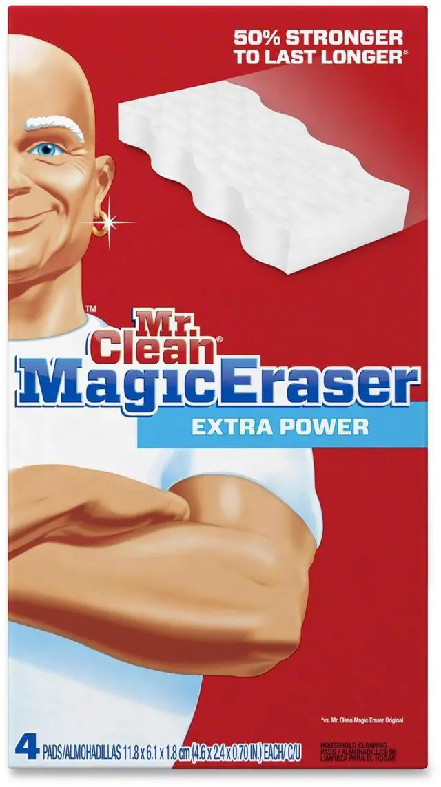 Mr. Clean Magic Eraser is a powerful all-purpose cleaner that removes scuff marks, dirt and grime from a variety of surfaces around your business. This Mr. Clean multi-surface cleaner uses innovative, textured, water-activated cleaning pads as micro-scrubbers to reach into surface grooves and lift away the toughest soils with water alone. It is 50% stronger than Mr. Clean Magic Eraser Original for heavy-duty cleaning, holds up to tough messes better, and lasts longer between replacements. Sponge Type: Scrub Sponge; Material(s): Foam; Shape: Wavy Rectangle; Width: 4.6.