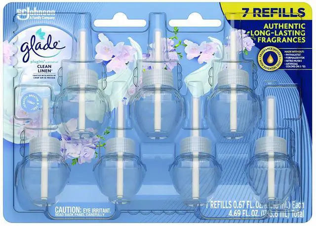 Glade PlugIns Scented oil continuously adds fragrance to scent any room no matter the size and are fragrance infused with essential oils. Experience up to 50 days of fragrance per refill when used on low setting. Use only with Glade PlugIns Scented Oil Warmers. Made without phthalates, formaldehyde, nitro musks, artificial colors or dyes. Use as directed and wash hands after handling. Scent: Clean Linen; Physical Form: Oil; Application: Air Freshener; Volume Capacity: 0.67 oz.