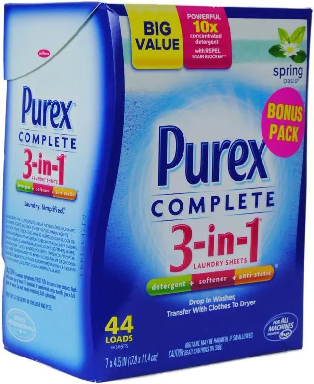 Purex Complete 3-in-1 laundry sheets are a loads worth of detergent, softener, and antistatic all on one powerful sheet
