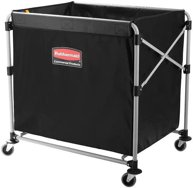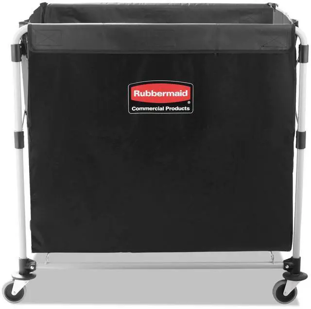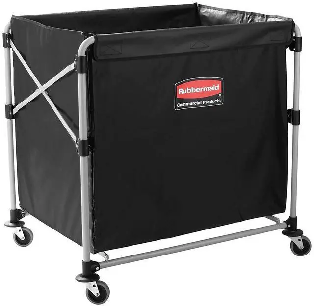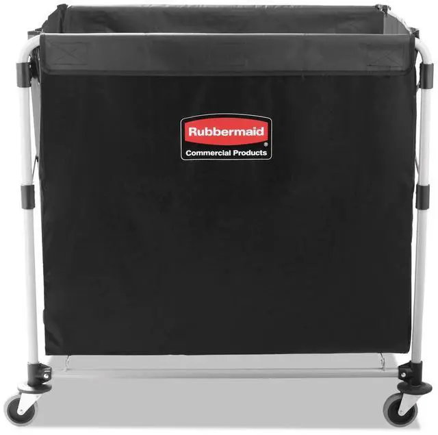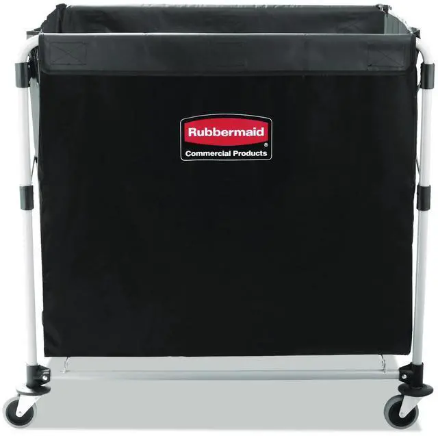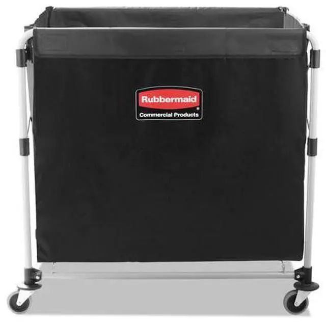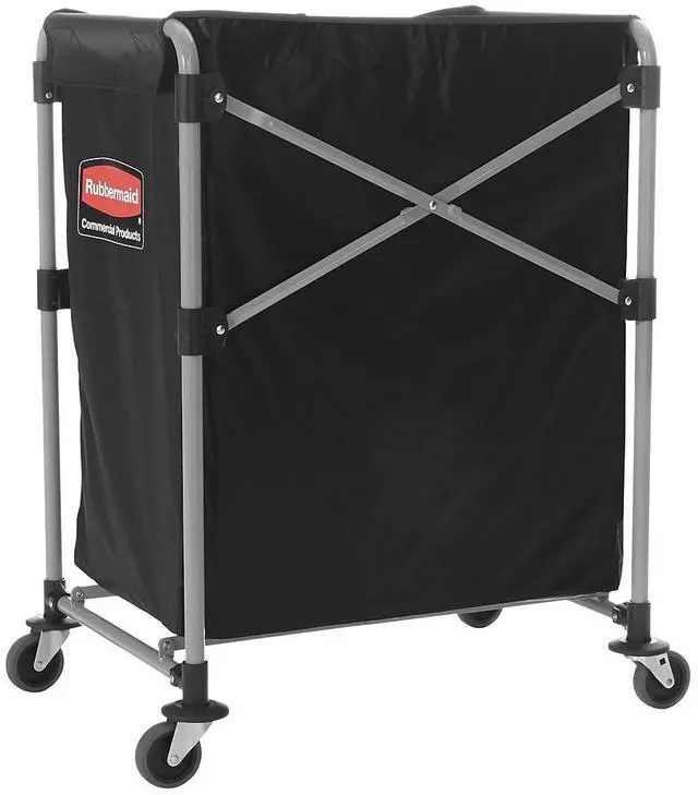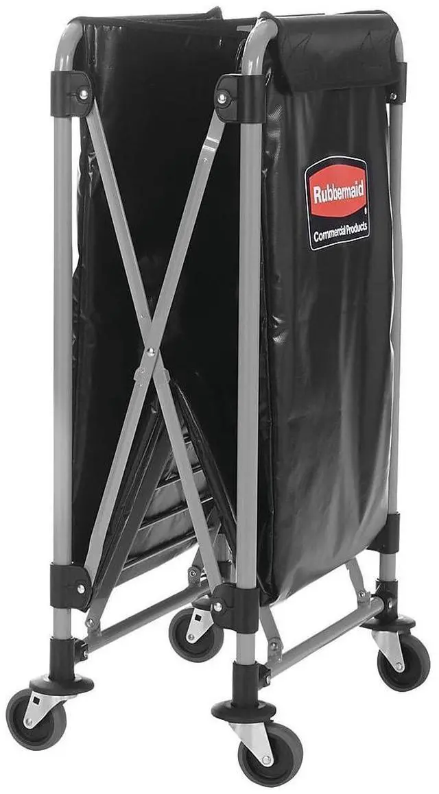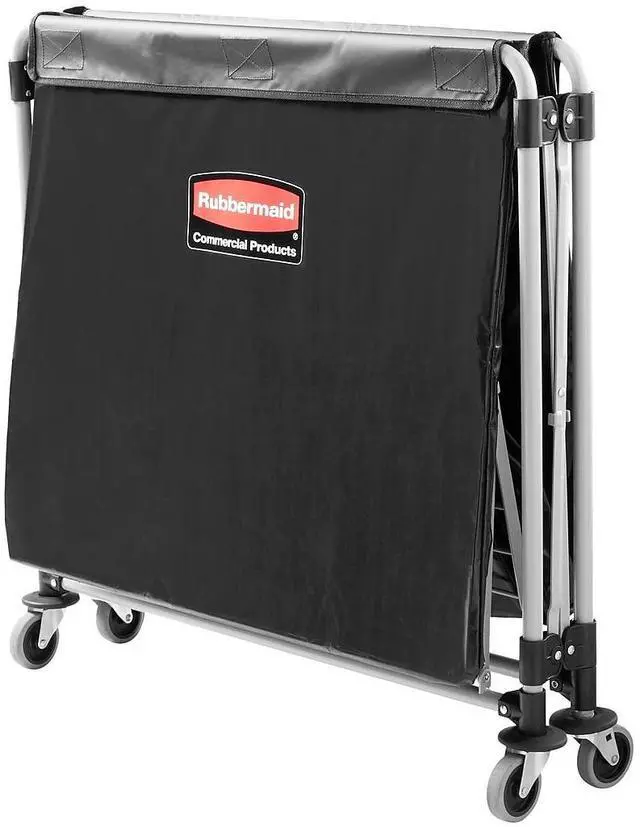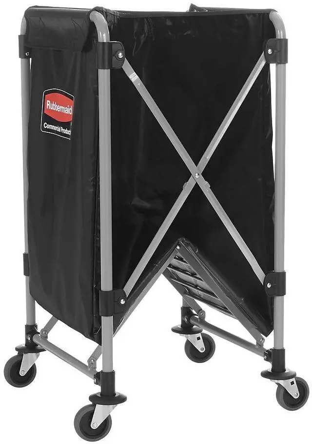 The Rubbermaid Commercial collapsible X-Cart is a durable, easy-to-maneuver basket truck that efficiently transports large, bulk loads, then conveniently collapses to minimize storage footprint. Stainless steel, powder-coated frame supports 220 lb. and prevents rusting. Compact, collapsible frame enables efficient storage. Color-coded ribbons classify transport materials to prevent cross-contamination. Includes easy-to-clean detachable bag and bumper guards for extra protection during transport. Collapsible Basket X-Cart, 8 bu. Cap.