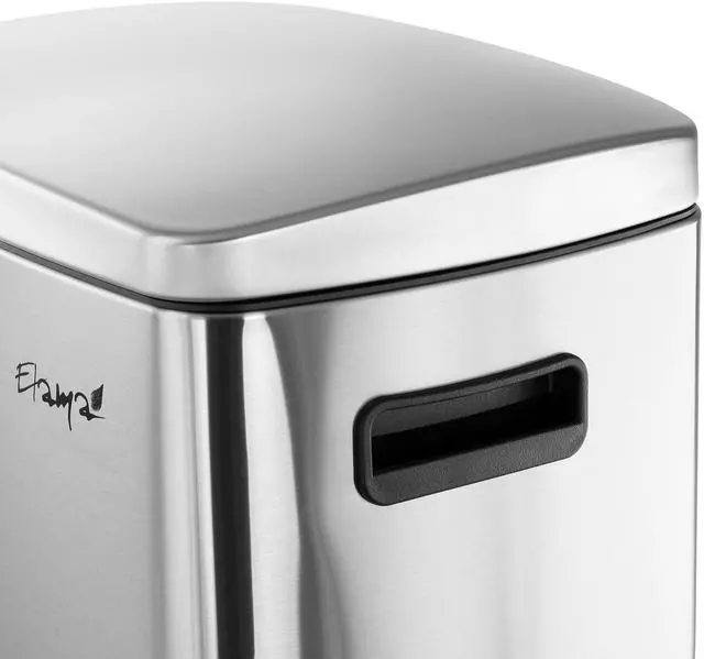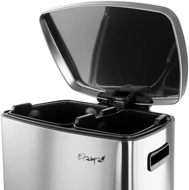 Elama's 10.6 Gallon Matte Silver Split Trash Bin is the ideal choice for any Home or Kitchen with its stainless steel, easy to clean finish and no touch pedal open function. This trash bin features a strong steel pedal engineered for a smooth and easy step that gives it stable operation, and two removable inner plastic buckets for convenient trash disposal. Dual inner buckets allow you to easily separate trash without the hassle of needing two cans. This bin includes one small 4 gallon inner bucket and one larger 6.6 gallon bucket, allowing you to separate your trash and recycling all in one place.