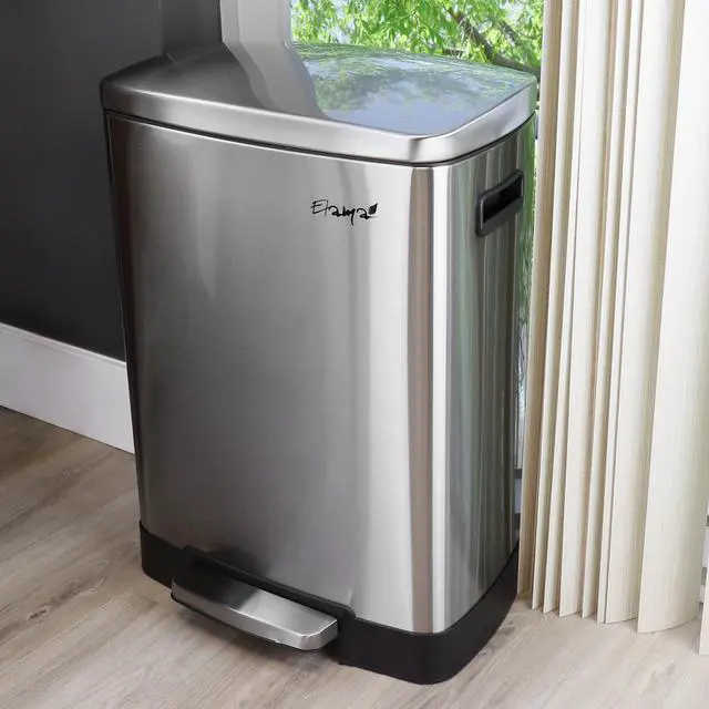 Slow close lid is smooth and prevents loud slamming or fingers getting caught, while the built in side handles let you move can freely without needing to touch the bin. Keep your home and kitchen neat and tidy with this classic rectangular silver finished trash bin!