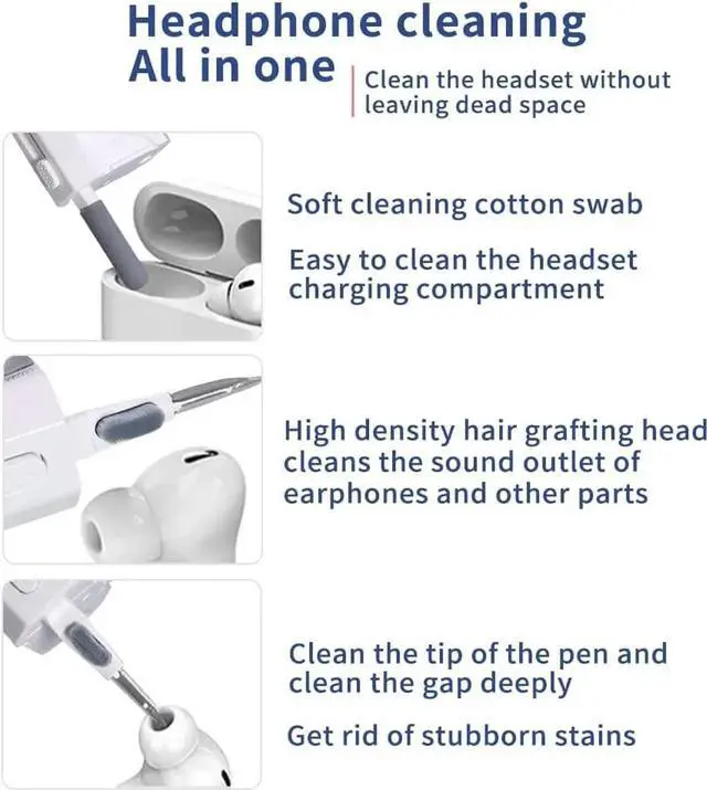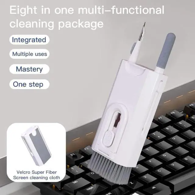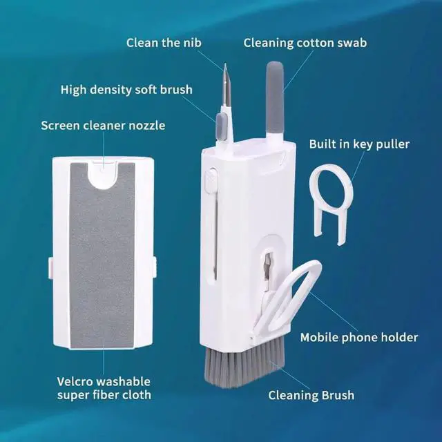 Multi-Function Cleaning Kit: Our Multi-Function Cleaning Kit has eight parts, namely cleaning stick, high-density soft brush, hidden brush, washable fiber flannelette, cleaning tip, mobile phone holder, screen Cleaning fluid nozzle (cleaning fluid not included), built-in key puller.