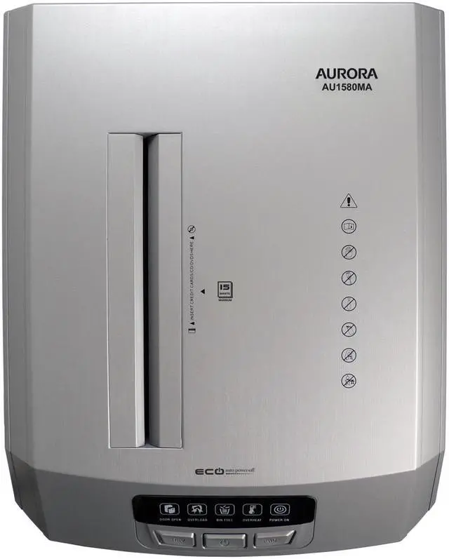 Aurora AU1580MA Professional Grade High Security 15-Sheet Micro-Cut Paper/ CD and Credit Card Shredder/ 60 Minutes Continuous Run Time * Micro-Cut with 15 sheet capacities; destroys CDs, DVDs, credit cards and small paper clips * Shreds paper, CDs, DVDs, credit cards into small pieces (5/32 by 15/32 inches), security level P-4 * Nonstop 60-minute continuous run time; Anti-jam Auto-reverse to clear paper jams * Energy saving system auto power off. Ultra-quiet operation. * 8.5 -gallon pullout bin with LED indicator lights Standby/ Overheat/ Bin-full/ Overload/ Door open status