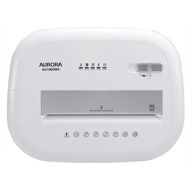 Product Description: The Aurora AU1060MA professional grade 10-sheet high security Micro-Cut paper and credit card shredder with 6-gallon pullout basket is the perfect business and home office device to keep you safe from identity theft. The AU1060MA accepts up to 10 sheets of paper at a time and shreds them into small pieces (3/32 by 15/32 inches_ 2 x 12mm), security level P-5.