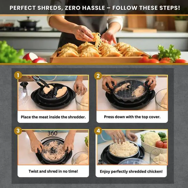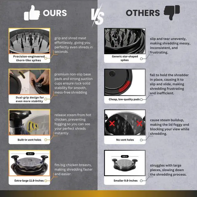 DESIGNED FOR LARGE CUTS & FASTER PREP Built with an extra-large shredding chamber, this chicken shredding tool is engineered to handle large chicken breasts and bigger cuts of meat efficientlyreducing prep time and ensuring consistent, perfectly chicken shredded