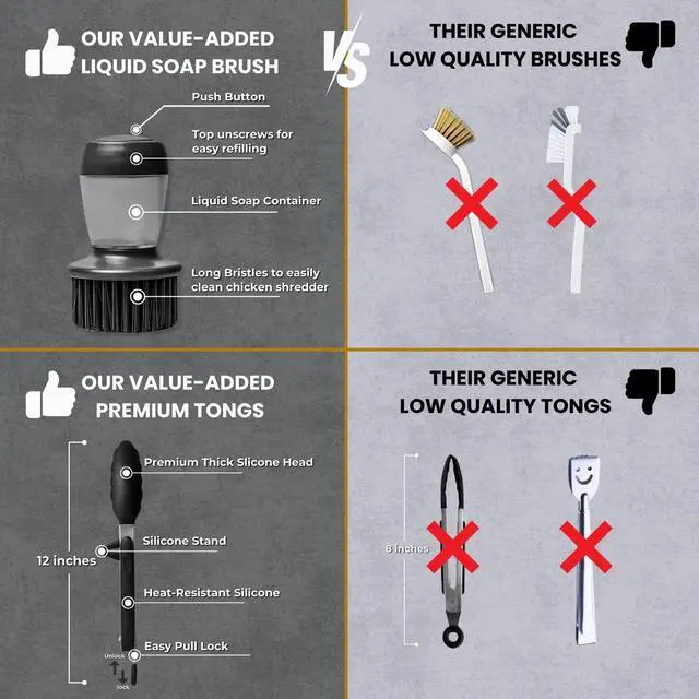 PREMIUM-GRADE TONGS FOR SAFE HANDLING The Chicken Shredder comes complete with durable, heavy-duty tongs crafted for accuracy and strengthperfect for safely gripping and transferring hot chicken pieces during preparation