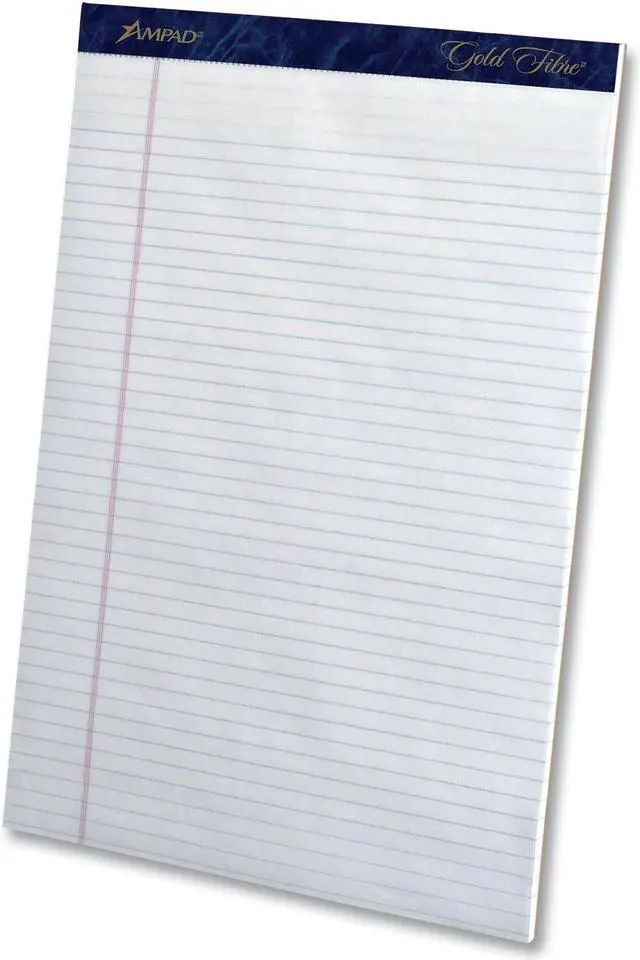 Ampad Gold Fibre Writing Pads have smooth, premium-weight writing paper that resists ink bleeding and show through. Extra-strong rigid chipboard backing for easy handheld use and provides firm writing support. Classic format preferred by attorneys and professionals gives quick access to notes. Micro-perforated sheets detach easily for a tidy book. Crisp line ruling allows writing to stand out from page. Pocket-Sized Indicator: N; Pad-Binding Type: Stapled; Pad-Binding Details: Heavy-Duty Staples; Pad-Binding Edge: Top.