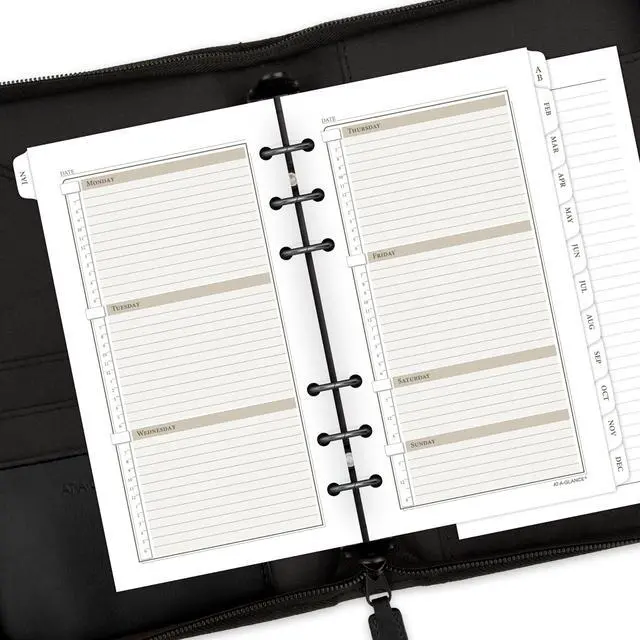 Keep track of deadlines, special events and more with clear and simple organization. The AT-A-GLANCE Textured Faux Leather Starter Set is undated so you can start planning at any time. It contains a variety of planning pages to help you find the best way to track your schedule. This set comes with 12 monthly spreads for year-round planning. Each month is tabbed, has ruled daily blocks and 8 months reference calendar blocks. Pages measure 5-1/2" x 8-1/2". Set includes 60 two-page daily planning spreads for daily organization. It also contains 60 single-page daily planning pages for appointments.