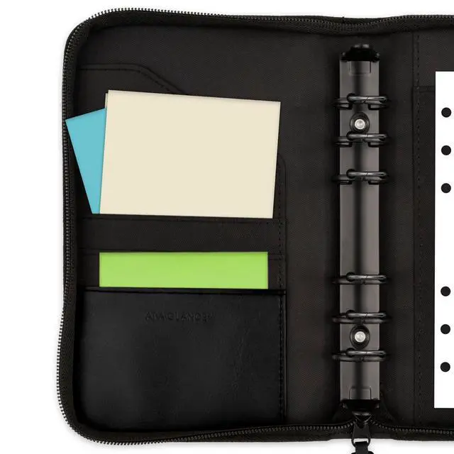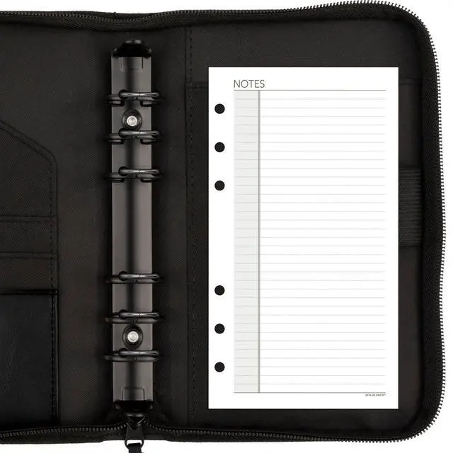 Set includes 8 weekly planning spreads, which have hourly appointments 7: 00 a. m. - 6: 00 p. m. Monday - Friday. This 7 ring, desk size binder has a Black, textured, faux leather cover, interior storage pockets, address and phone sections, 24 notetaking pages, a note pad and a pen loop. Refill the binder each year with your favorite loose-leaf fill.