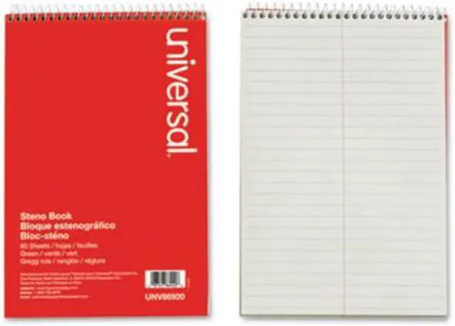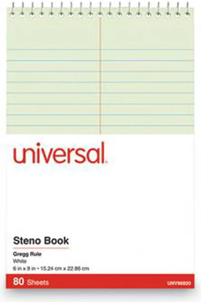 Whether youre taking notes at a meeting or conducting an interview, this 6" x 9" Universal Steno Book is designed for optimal shorthand writingits pages feature the traditional single margin line drawn down the middle. The paper contrasts with dark ink colors for easy-to-read writing, and the plastic wire binding along the top is snag-free to keep your pages turning easily. Pocket-Sized Indicator: Y; Pad-Binding Type: Spiral Coil; Pad-Binding Details: WireLock Coil-Locked: Soft Cover; Pad-Binding Edge: Top.