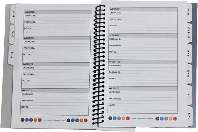 Make life easier and keep all of your password information together in one convenient location. Twelve, 1/6-cut alpha tabs help you organize your various accounts, so you can flip directly to the entry you need. A standardized entry format provides boxes for the website address, date and your user-name as well as plenty of space for your password, security questions and any additional contact information you might have for the associated organization. Sturdy, bend-, tear- and scratch-resistant cover along with premium paper stock helps ensure your important information is kept neat and clean. Pocket-Sized Indicator: Y; Book-Binding Type: Spiral Coil; Book-Binding Type: Side.