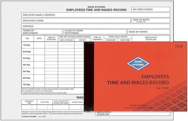 Employees Time & Wages Record Book Book of 52 No.76S Time Sheets detailing starting and finishing times, total daily hours worked (ordinary and overtime) and meal breaks.