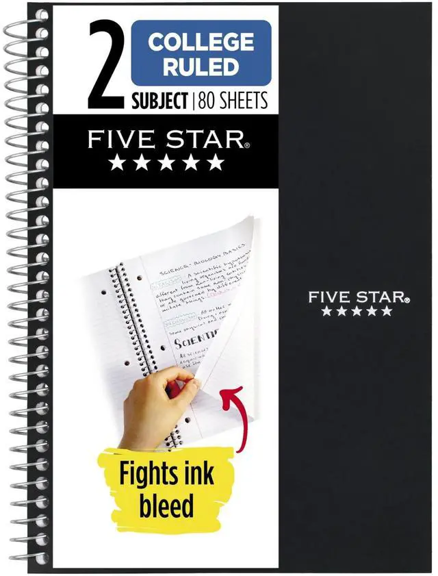 The Five Star 2 Subject College Ruled Notebook is perfectly sized for notetaking and homework on the go. Dont be fooled by the size! This Five Star Notebook gives you plenty of space to write out notes, ideas, reminders and more no matter where you go. The compact size easily fits in a backpack, gym bag or purse.
