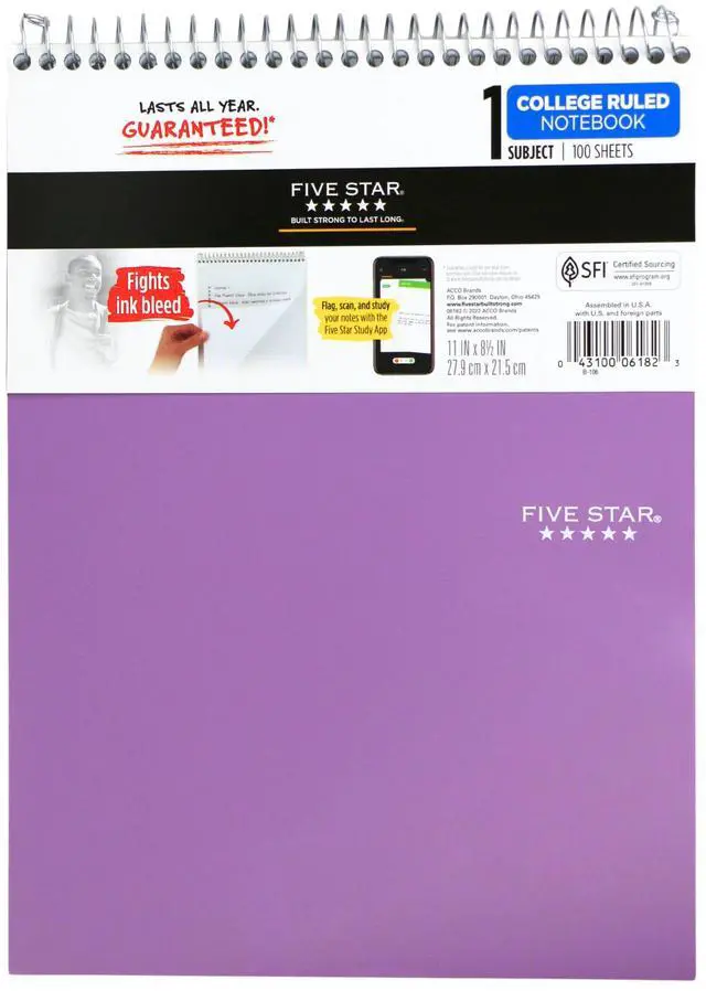 Choose a notebook that keeps up with your busy school day. The Five Star 1-Subject Spiral Top Bound Notepad is college ruled and a smart choice for all your notetaking needs. You can count on a Five Star Note Pad throughout the year. The high-quality paper fights ink bleed, which lets you use both sides of the page to maximize notetaking space. The durable, water-resistant front cover helps protect your writing from wear, tear and spills.