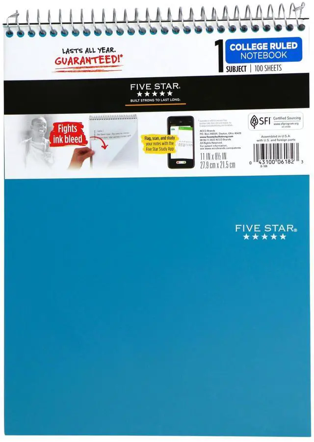 Choose a notebook that keeps up with your busy school day. The Five Star 1-Subject Spiral Top Bound Notepad is college ruled and a smart choice for all your notetaking needs. You can count on a Five Star Note Pad throughout the year. The high-quality paper fights ink bleed, which lets you use both sides of the page to maximize notetaking space. The durable, water-resistant front cover helps protect your writing from wear, tear and spills.