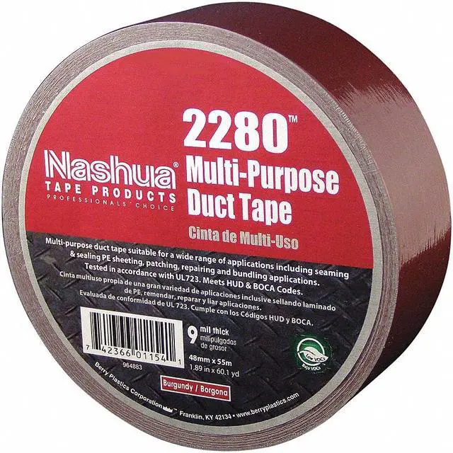 Berry Plastics Nashua general purpose PE coated cloth tape. High-tack adhesive bonds well to a wide variety of smooth and rough surfaces. Flexible PE backing conforms well to irregular surfaces and shapes. Smooth, consistent unwind provides ease of use in manual applications. Easy-tear cloth provides clean, consistent tear by hand. Tested in conformance with UL723. PE-coated cloth backing. Good balance of strength and conformability. Resists twisting and curling. Moisture resistant. Natural rubber based adhesive. Aggressive adhesion to smooth and rough surfaces. Low VOC content. Can contribute toward satisfying EQ Credit 4.1 (Low Emitting Materials) under LEED.