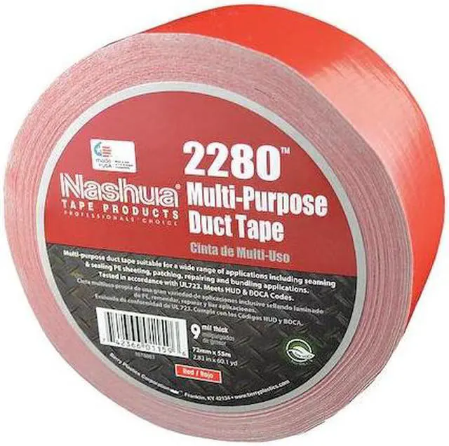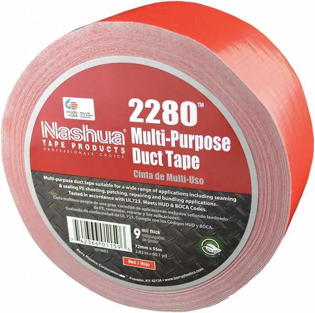 Berry Plastics Nashua general purpose PE coated cloth tape. High-tack adhesive bonds well to a wide variety of smooth and rough surfaces. Flexible PE backing conforms well to irregular surfaces and shapes. Smooth, consistent unwind provides ease of use in manual applications. Easy-tear cloth provides clean, consistent tear by hand. Tested in conformance with UL723. PE-coated cloth backing. Good balance of strength and conformability. Resists twisting and curling. Moisture resistant. Natural rubber based adhesive. Aggressive adhesion to smooth and rough surfaces. Low VOC content. Can contribute toward satisfying EQ Credit 4.1 (Low Emitting Materials) under LEED. Application includes general repair, sealing off polyethylene waste disposal bags, bundling and securing carpets, padding and protective sheeting for the convention and hotel industry, general purpose abatement and contractor uses, bundling, patching and mending, plumbing applications, color coding, heavy-duty box sealing. 9 mil thickness. Adhesion to steel: 70 ounces per inch. Smoke developed: 5. Tensile strength: 24 pounds per inch. Operating temperature: 40 to 200 degree F. Elongation: 20 percent. VOC content: less than 3 grams per liter.