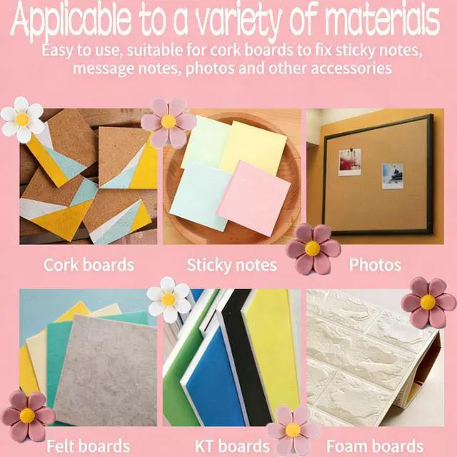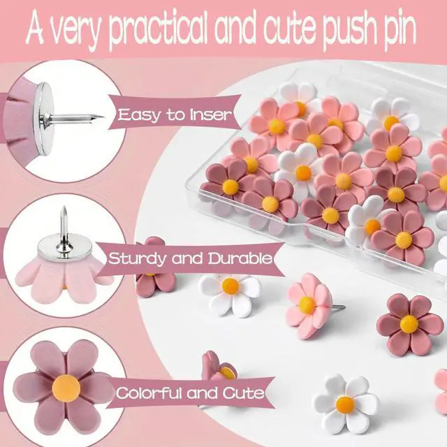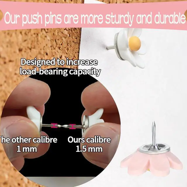 Quality MaterialHigh-quality resin flower heads + thick sturdy metal tips = durable decorative push pins. Push pins for bulletin board,Firm hold on cork boards/desks, cute floral look, way more robust than ordinary tacks.